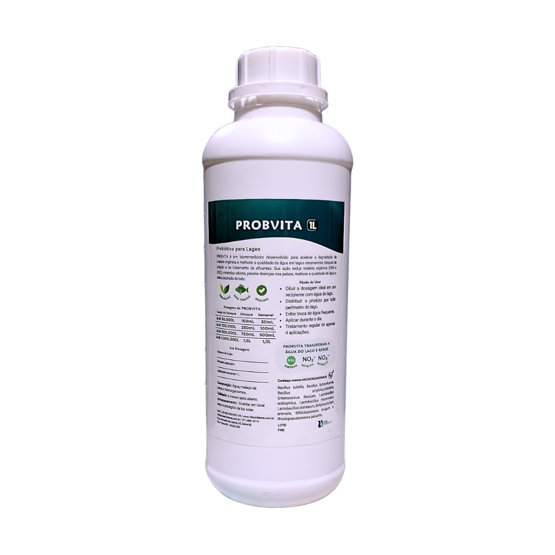 O Probvita é um probiótico com bactérias e nutrientes para tratar a água de lagos e efluentes, reduzindo amônia, nitrito, nitrato, matéria orgânica, DBO e DQO enquanto limpa o ecossistema.