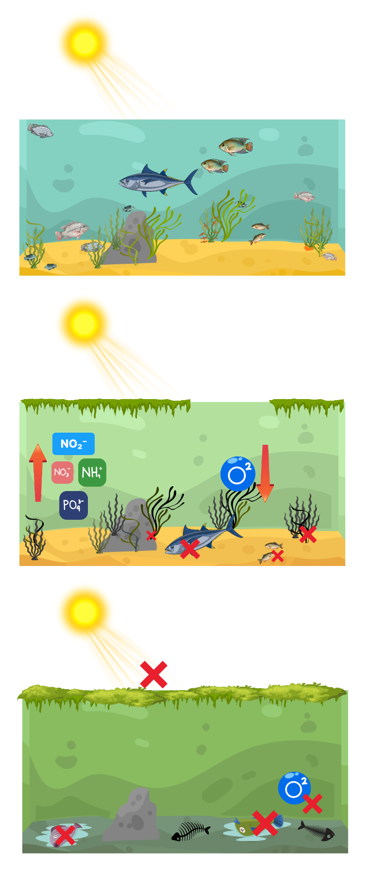 A eutrofização começa quando os níveis de fósforo e nitrogênio se tornam elevados e causam a proliferação excessiva de fitoplâncton, algas e plantas que se alimentam desses nutrientes, resultando em uma enorme quantidade de biomassa no ecossistema. Nesse primeiro estágio há a formação de uma camada de algas na superfície e o esverdeamento na água, reduzindo a entrada de luz solar e prejudicando a fotossíntese das plantas submersas. Em seguida, essas plantas que não conseguem realizar fotossíntese se degradam, aumentando ainda mais matéria orgânica que por fim devolve os nutrientes a água.